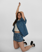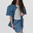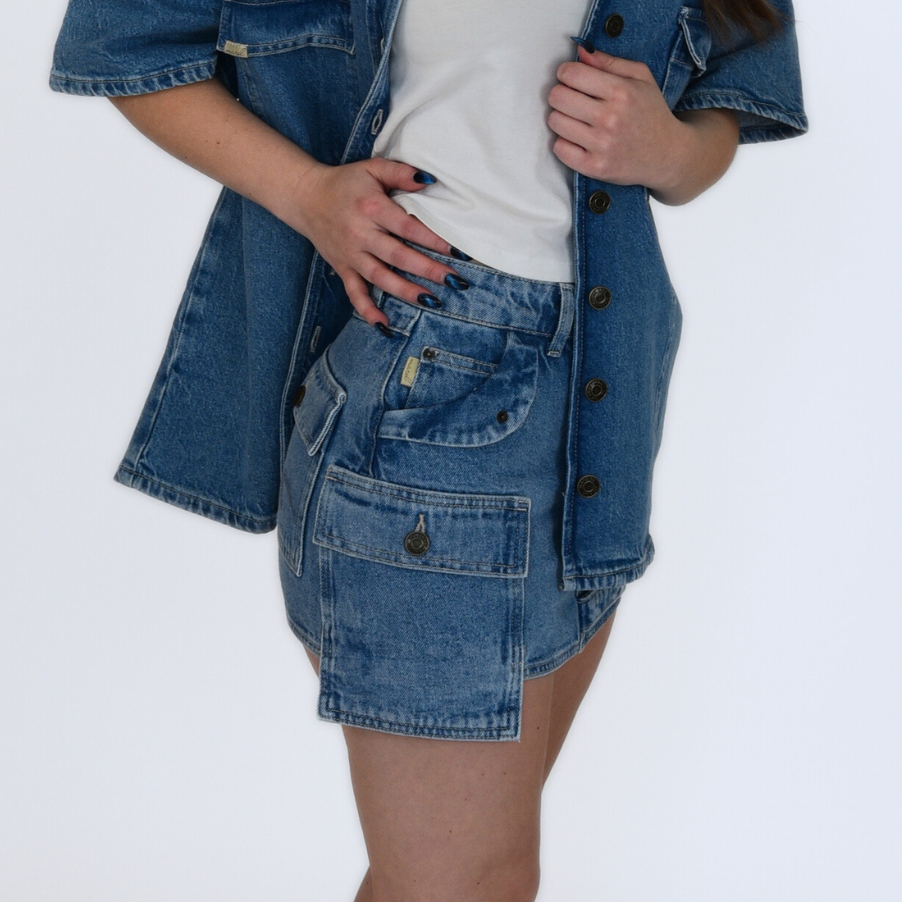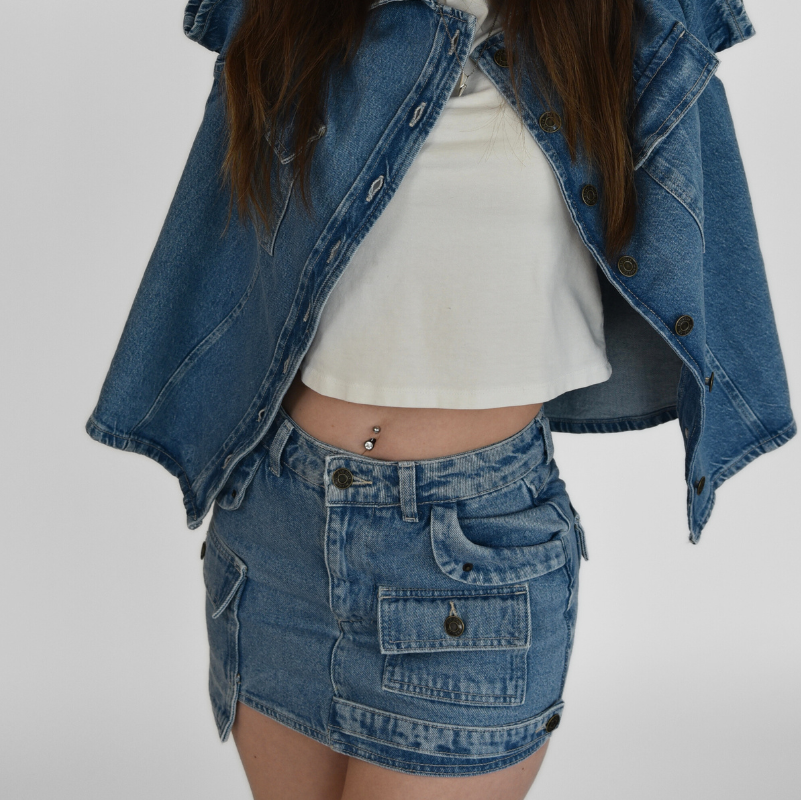 A utility-inspired take on classic denim. This medium-wash mini skirt is cut from non-stretch denim for a structured fit that holds its shape. Designed to sit comfortably at the waist, it features all-over cargo pocket detailing for a bold yet wearable statement. Clean lines, raw authenticity, and subtle design elements make this piece easy to pair—but never predictable.