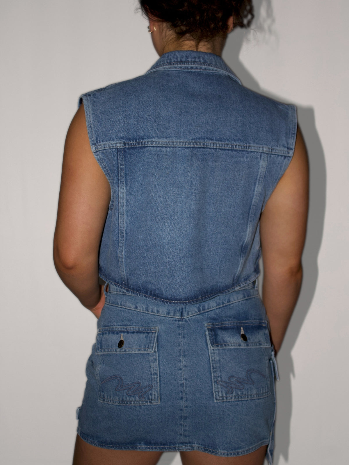 Effortlessly cool with a thoughtful twist — this medium-wash denim piece is designed to move with your style. Made from 100% cotton and finished with a soft tencel blend, it features a removable ruffled white hem that unzips for a second look in one. Functional pockets, a custom woven label, and signature buttons add subtle detail, while the embroidery inside the collar is a hidden nod to craftsmanship.